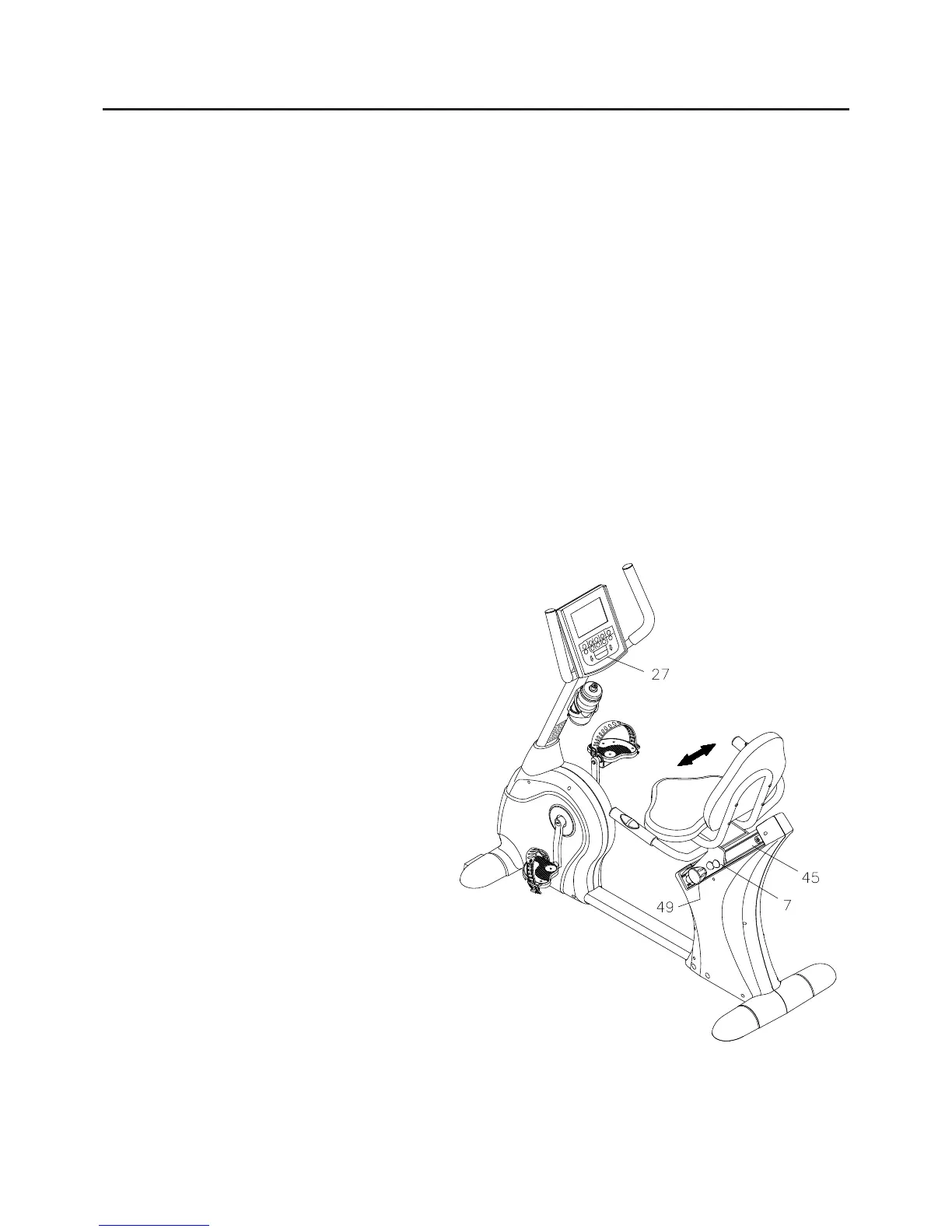 Be sure the ADJUSTMENT KNOB(49) is tightened. Sit on the seat and place your feet on the pedals.