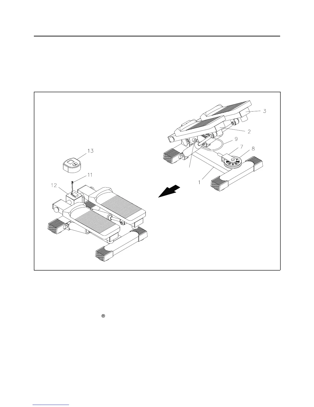 MAIN FRAME(1). Wrap the CABLE(9) around the PULLEY(8) and press the two PEDAL ARMS(2, 3)