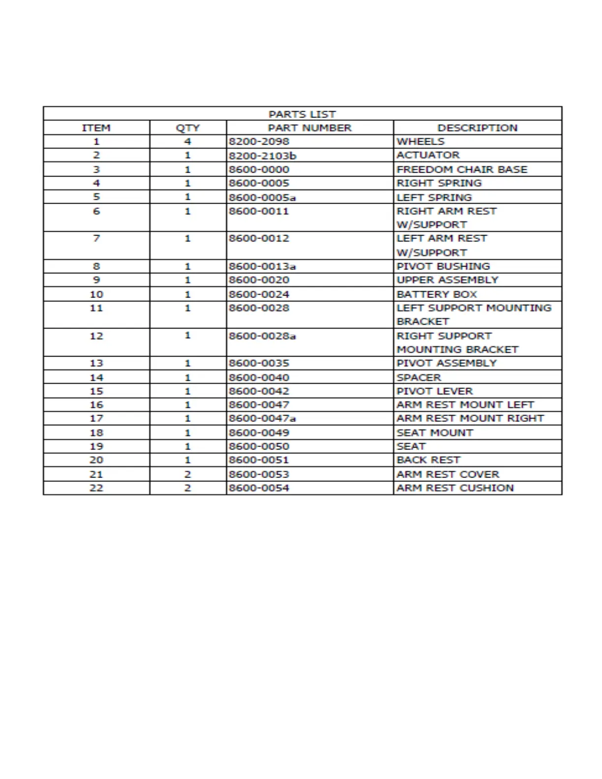 FREEDOM CHAIR PARTS LIST