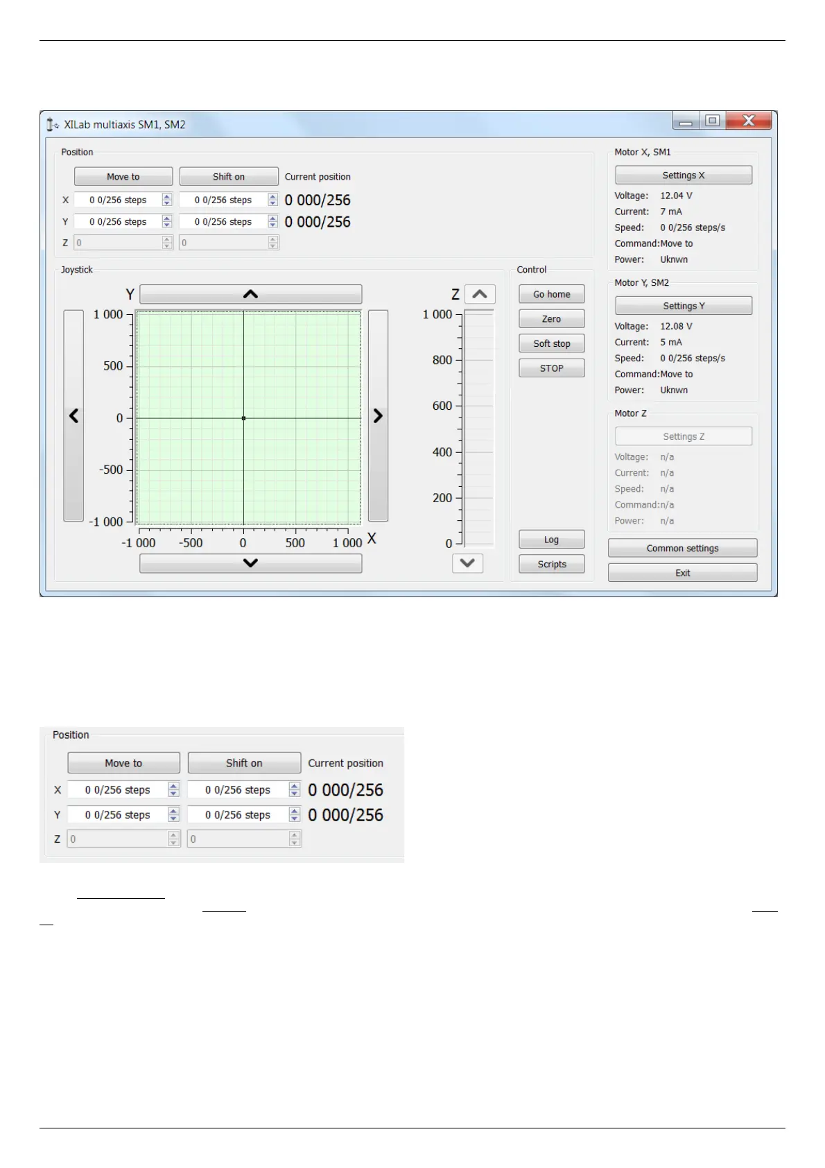 In the Current position column indicators of the current position in steps or calibrated units (see below) for the axes X, Y and Z (from