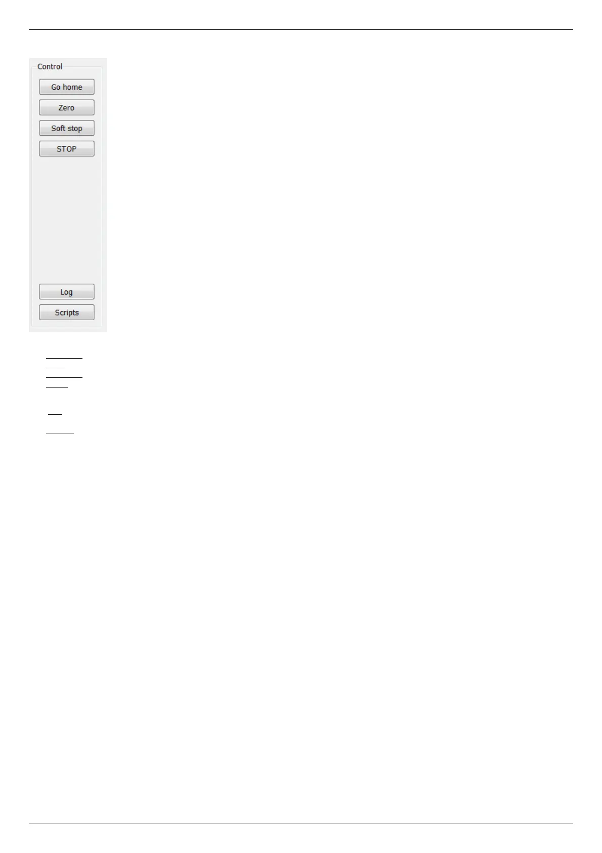 The STOP button sends an emergency stop command to each controller, resets their Alarm statuses, clears their command buffers for