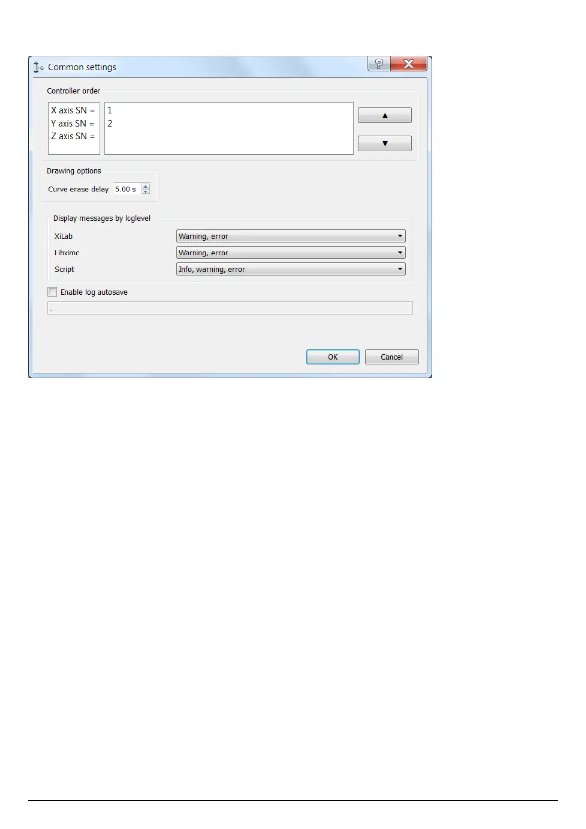 "Error, Warning, Info" to log errors, warnings and informational messages) for each source: XiLab itself, libximc library and Scripts