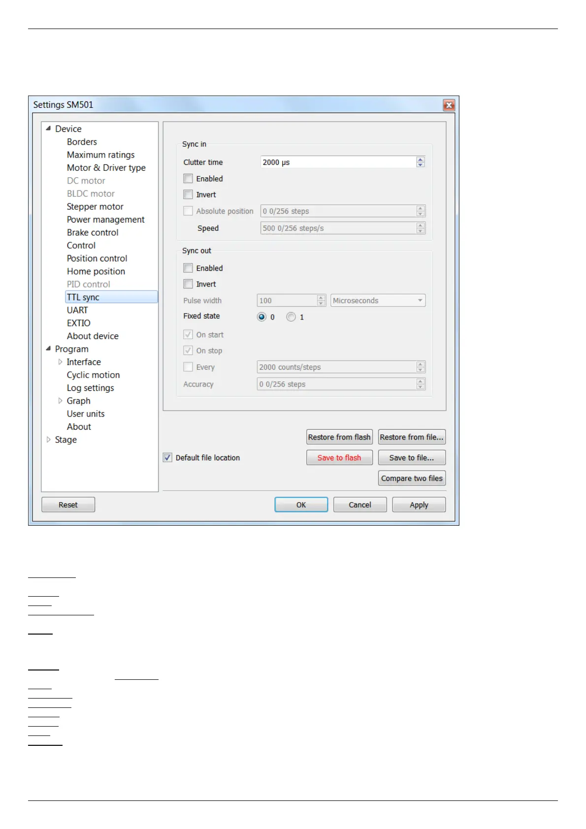 Absolute position - if the flag is checked, upon sync pulse the stage moves into the absolute position specified in the field Step/Micro