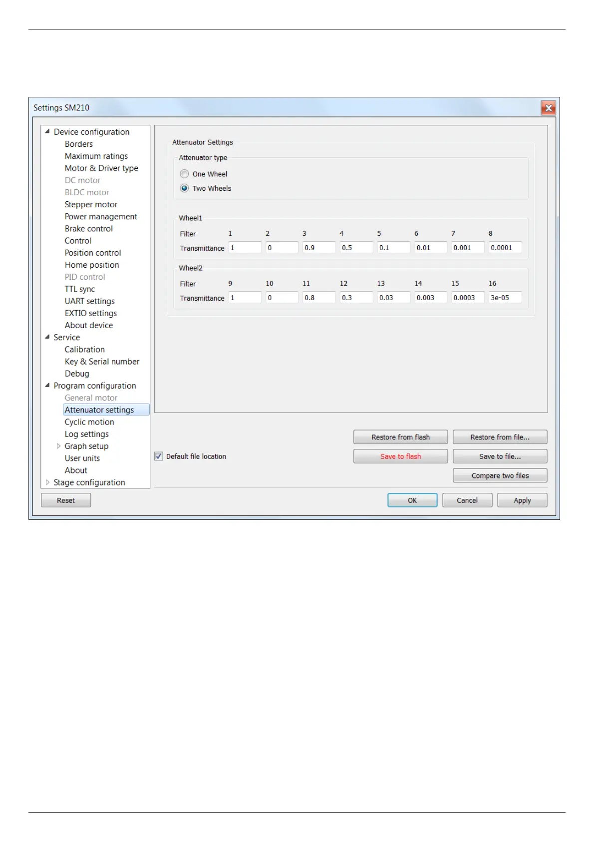 Depending on the choice here one or two Wheel groups become available. They should be filled with attenuator filters' transparency
