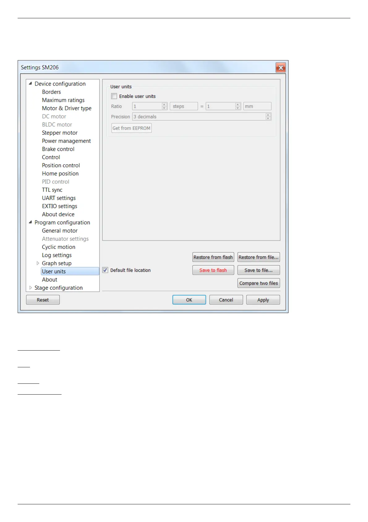 Enable user units - enables user unit display instead of steps (in case of stepper motor) or encoder counts (in case of DC motor). User
