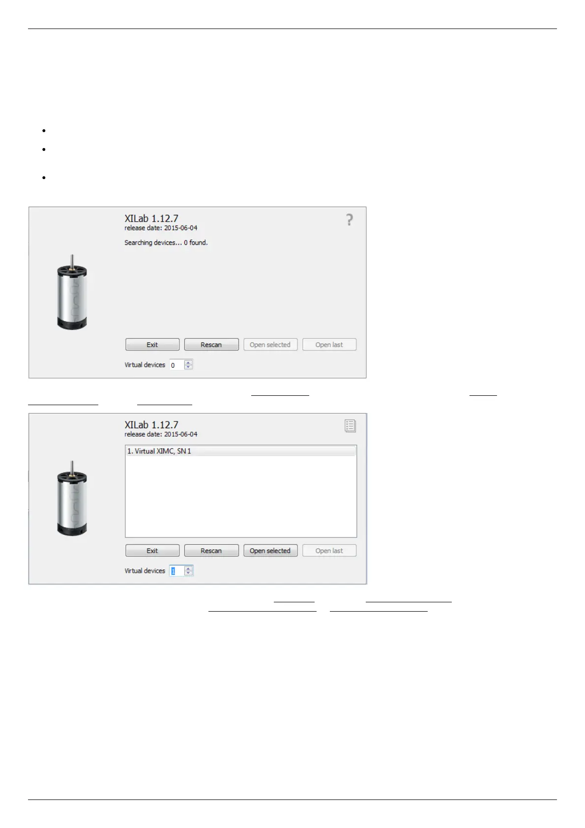 Add virtual XIMC controller by increasing the number of Virtual Devices in the bottom part of window and click Rescan. Then choose