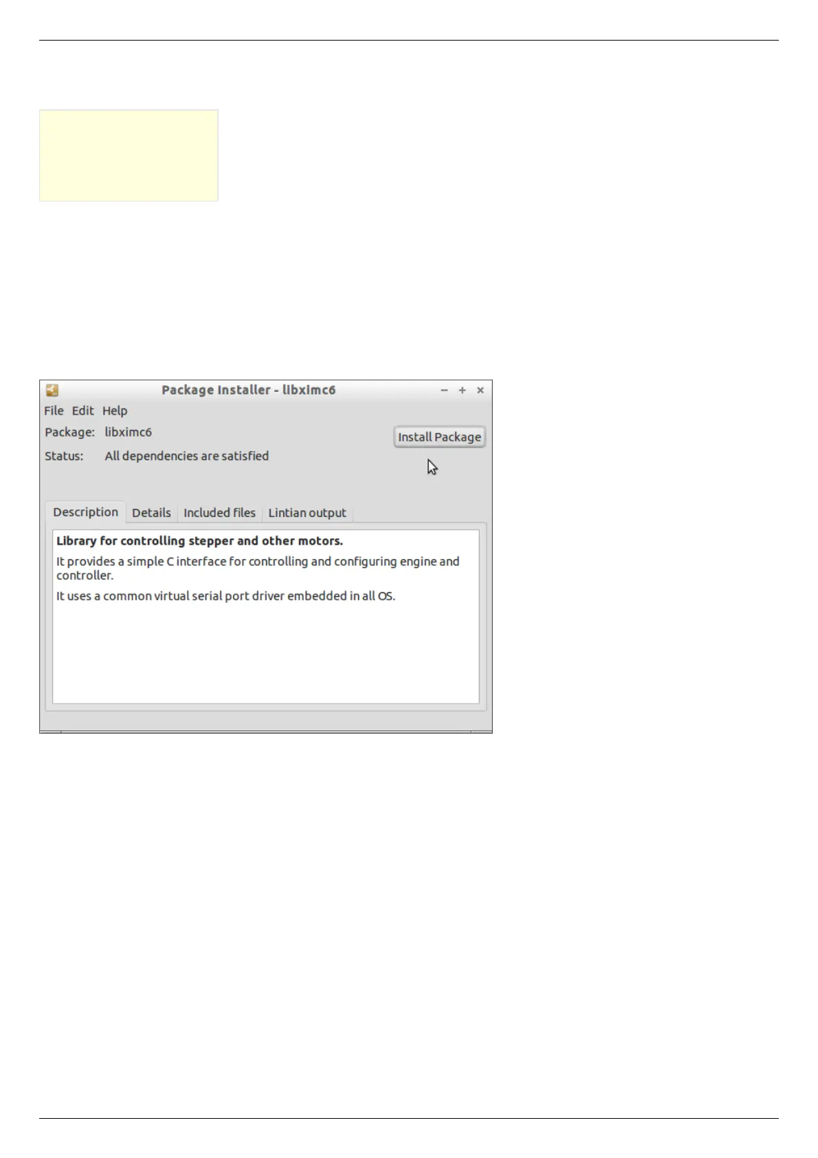 Installation window will appear. Click the Install package. This will install the libximc library.