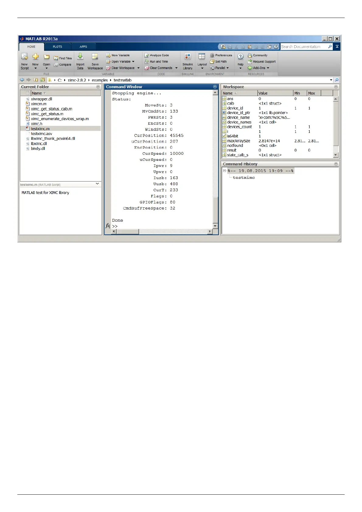 environment. Use loadlibrary Matlab function once to load libximc library, then use calllib Matlab function to call desired libximc