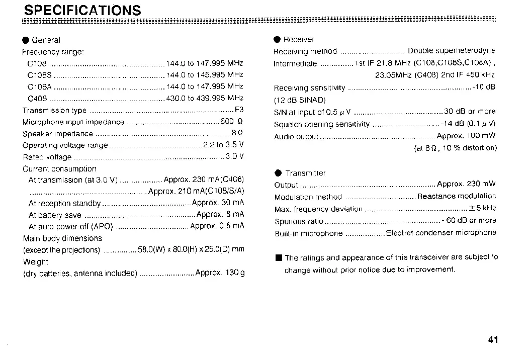 Standard C108 - SPECIFICATIONS; General Specifications; Receiver Specifications; Transmitter Specifications