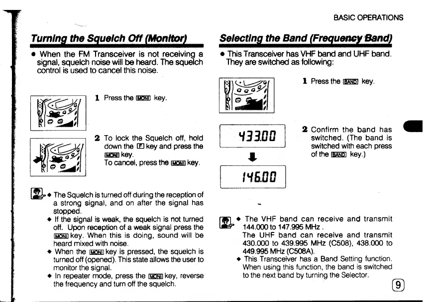 Standard C508 - Turning the Squelch Off (Monitor); Selecting the Band (Frequency Band)
