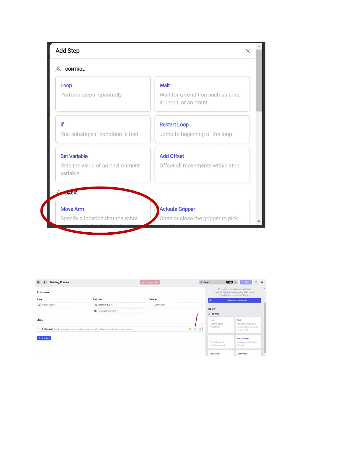 The Move Arm step will be added to the rst line of the Routine. The yellow ! Indicates that the step