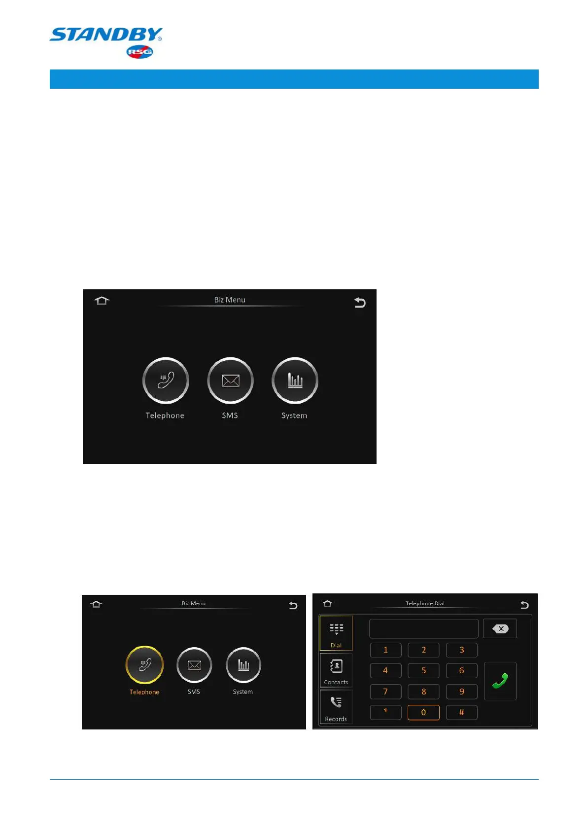 From left to right, the buttons on the screen are Telephone, SMS, and System.