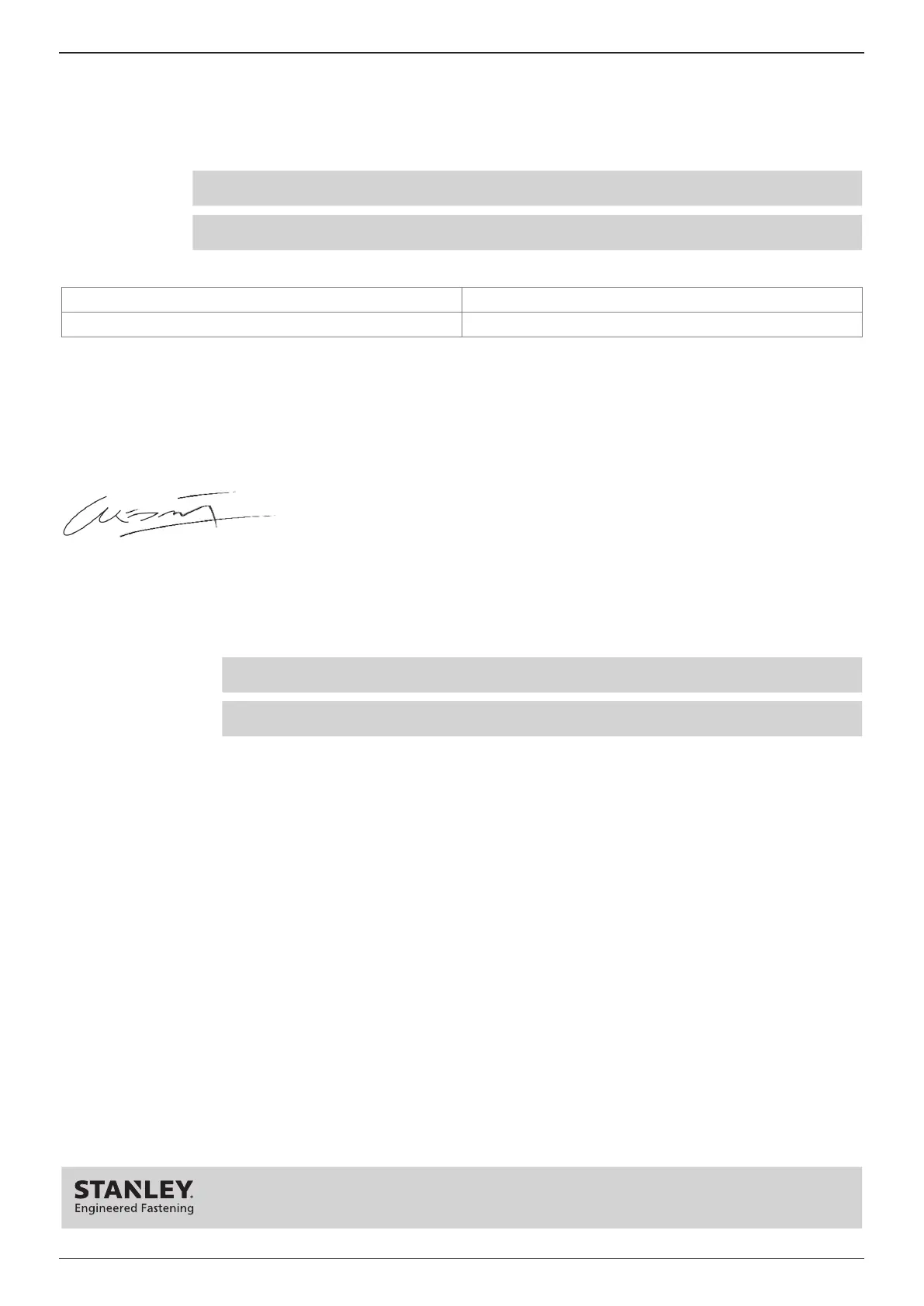 签字人负责汇编在欧盟出售的产品的技术文件,并代表 Stanley Engineered Fastening 进行此声明。