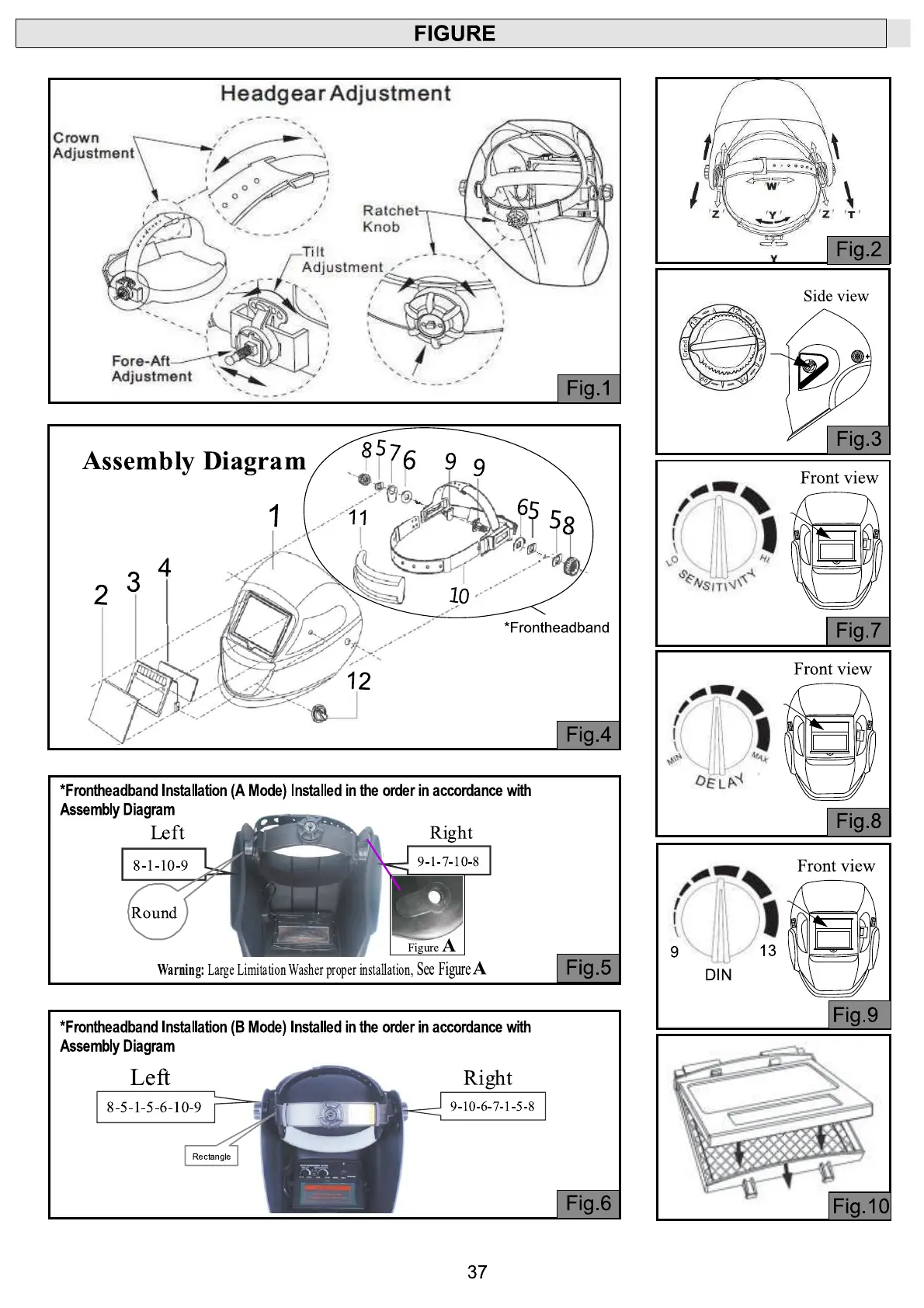 Stanley E-Protection 2000 E - Diagrams: Assembly and Adjustments; Headgear and Assembly Component Identification; Filter Control Dial Functions; Lens Replacement Visual Guide