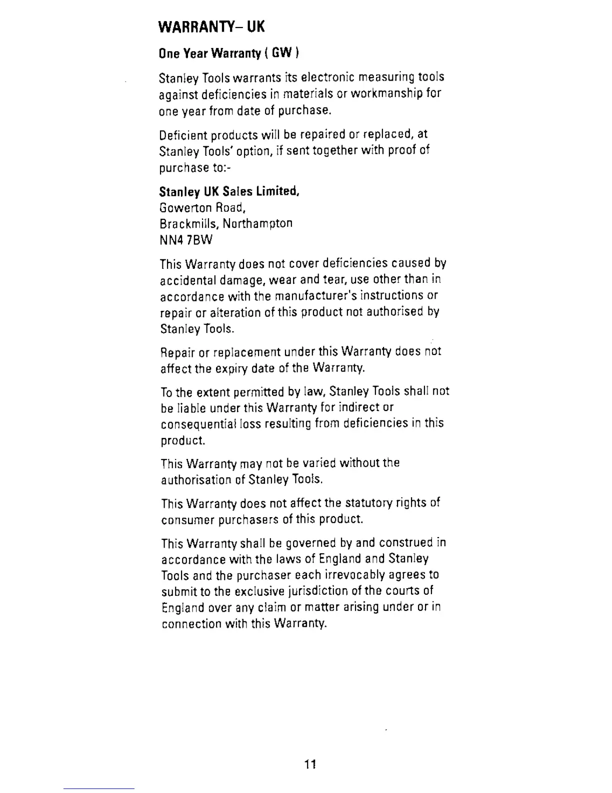 Stanley IntelliSensor Pro - Warranty Information; UK Warranty Details; Service Contact Information