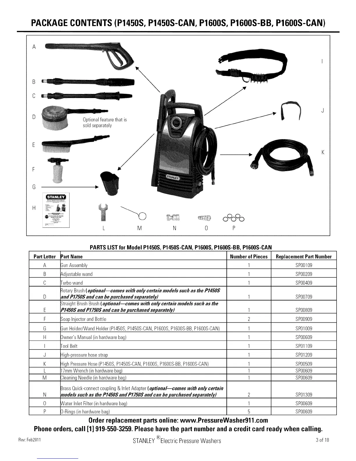 PARTS LIST for Model P1450S, P1450S-CAN, P1600S, P1600S-BB, P1600S-CAN