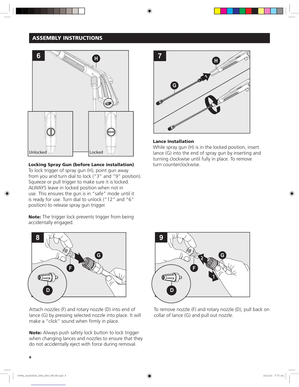 Attach nozzles (F) and rotary nozzle (D) into end of