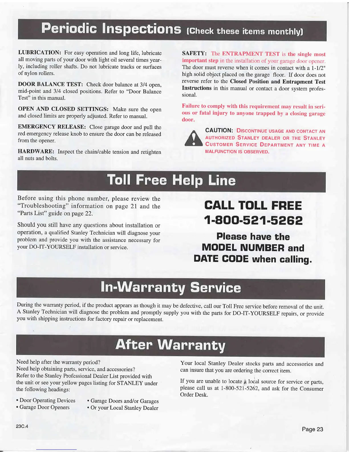 Stanley U-INSTALL - Periodic Inspections and Maintenance; Monthly Inspection Checklist; Safety and Entrapment Testing; Help and Service Information