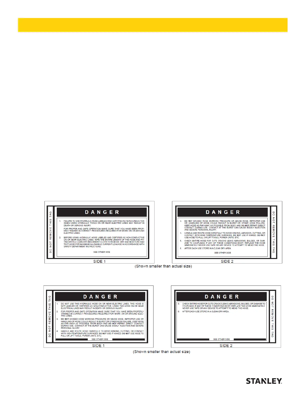 To help ensure your safety, the following DANGER tags are attached to all hose purchased from Stanley Hydraulic