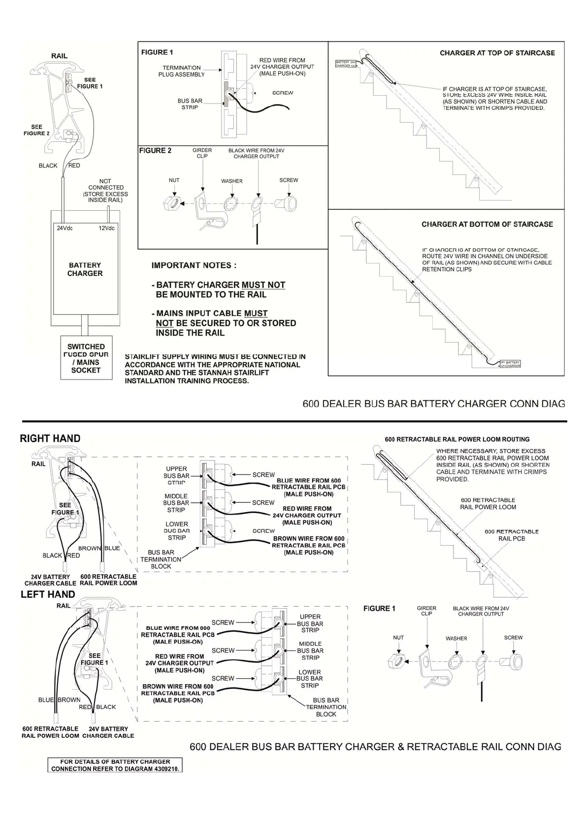 Stannah 600 - 600 DEALER BUS BAR BATTERY CHARGER CONN DIAG; 600 DEALER BUS BAR BATTERY CHARGER & RETRACTABLE RAIL CONN DIAG