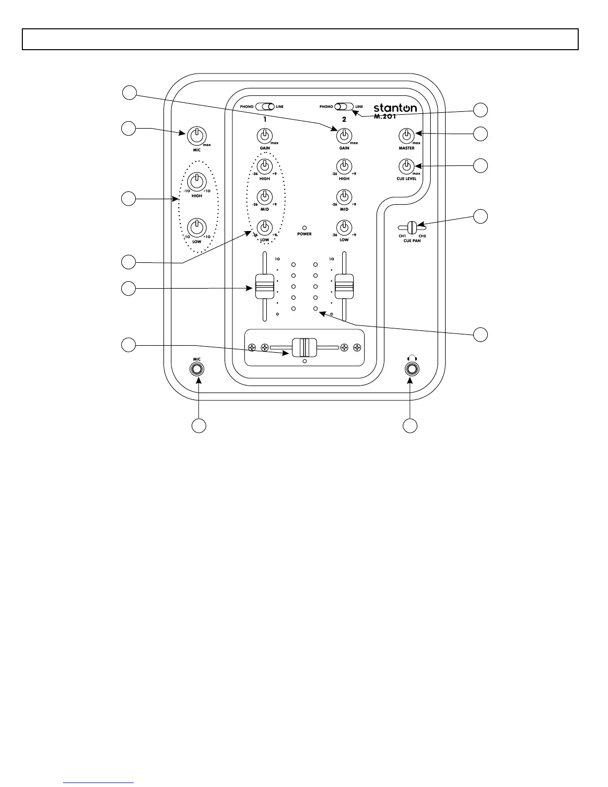 12. Level Indicators – The dual LEDs indicators are used to indicate the master output level of channels