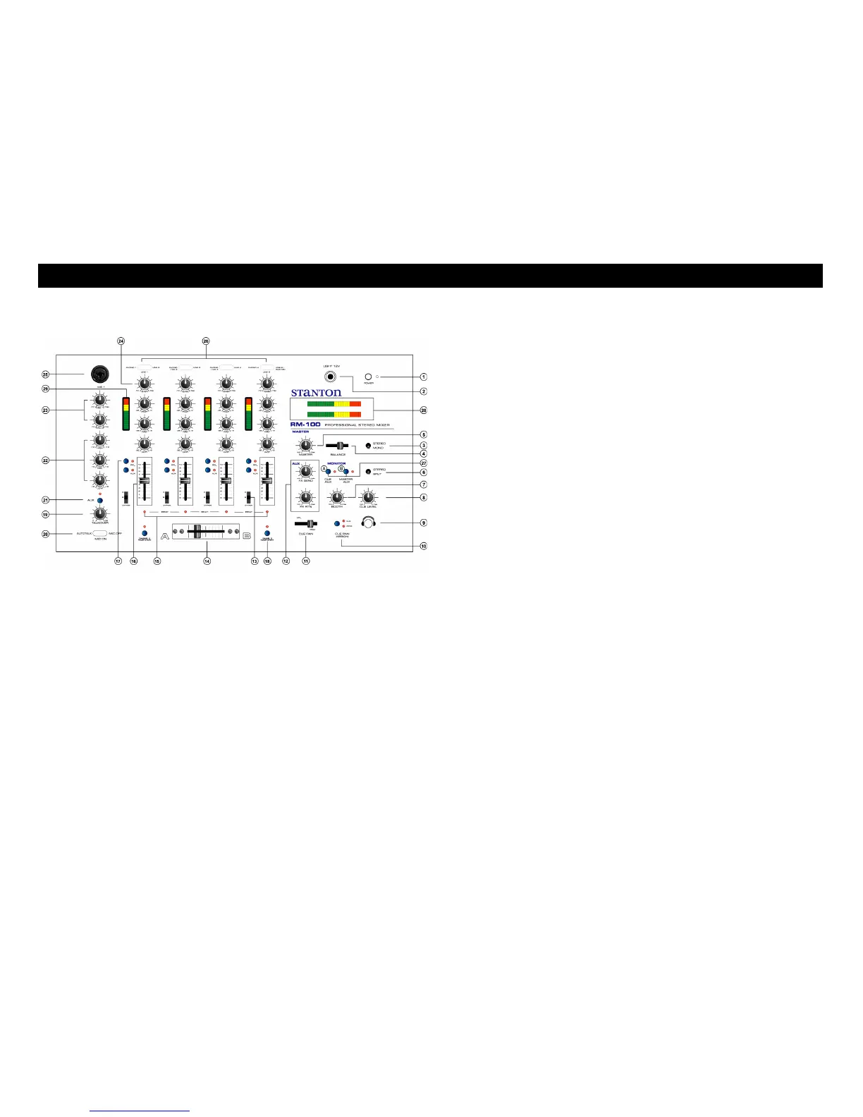 24. Input channel controls: Controls the input sensitivity of each channel and Hi, Mid,