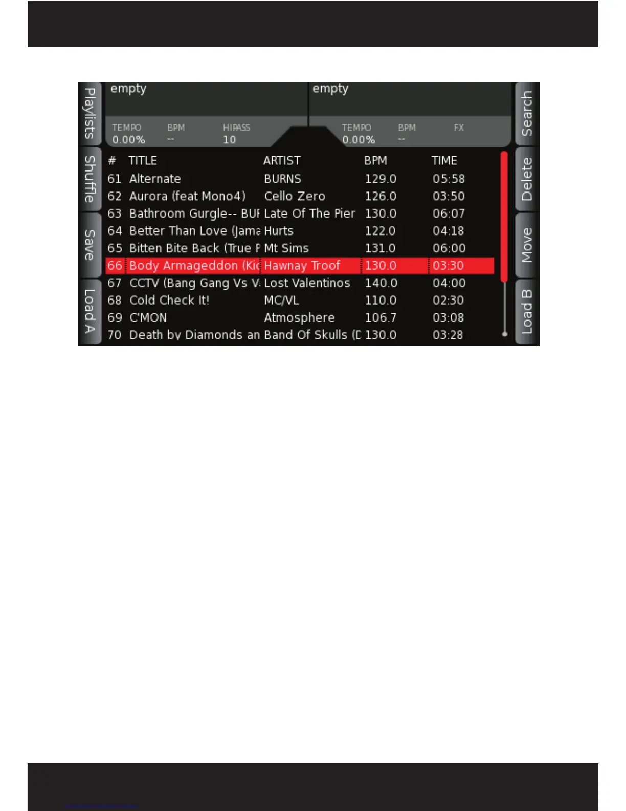 loaded a playlist, this display contains any songs that have been previously loaded on to DECK A