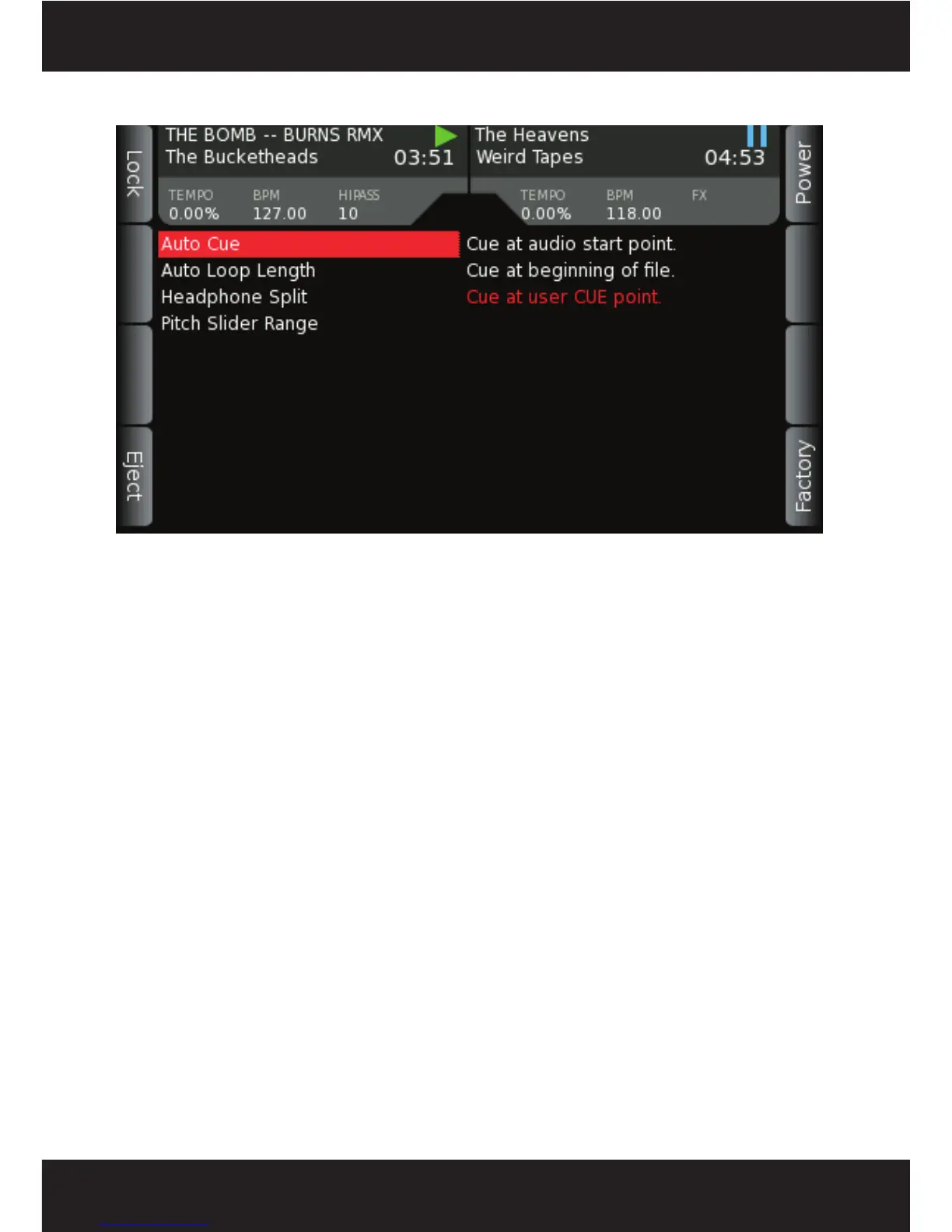 Auto Cue – Chooses between the following CUE POINT behaviors: