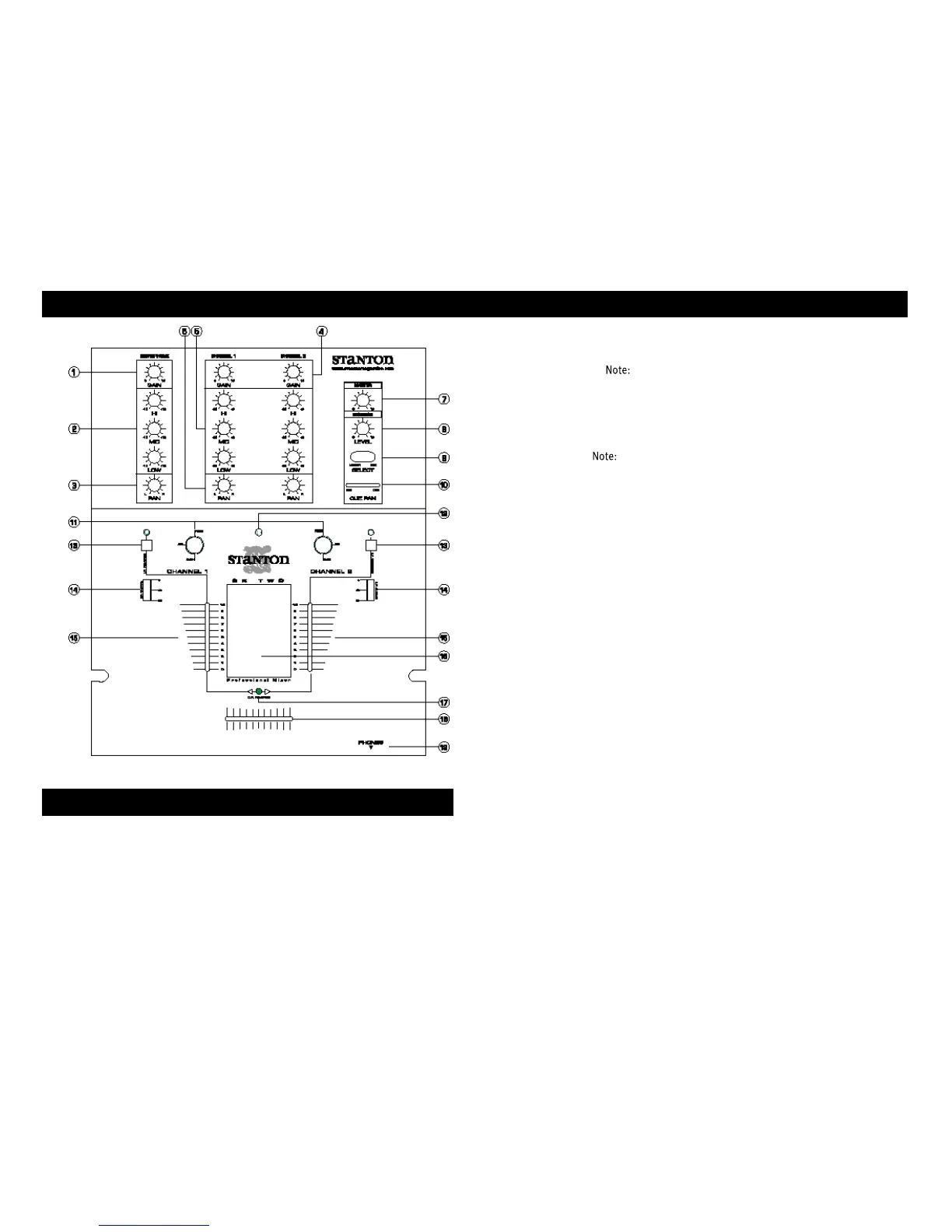 18. Crossfader: Fades the master output between channels 1 and 2.