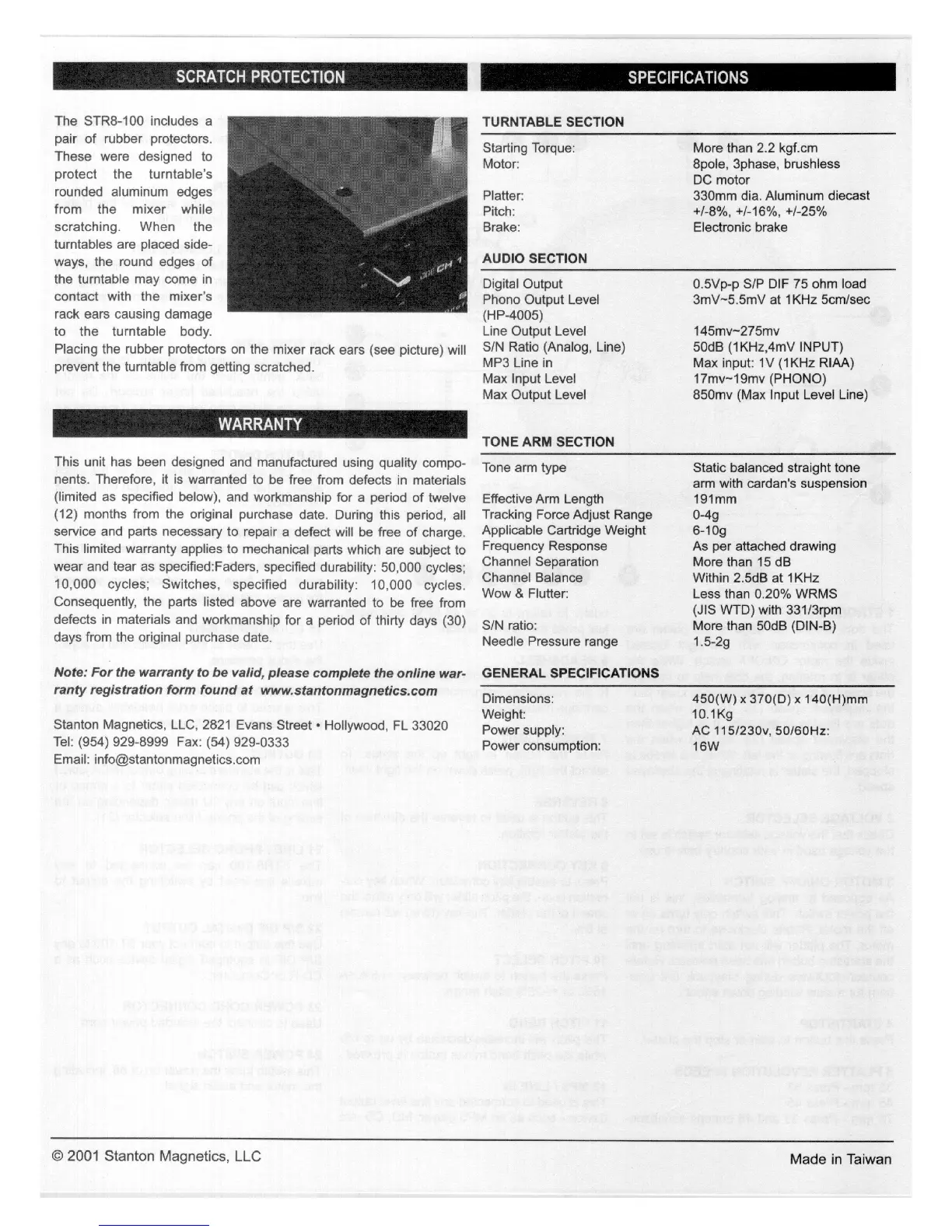 Stanton STR8-100 - Turntable Specifications and Features; Scratch Protection Features; Technical Specifications Overview; Warranty Information