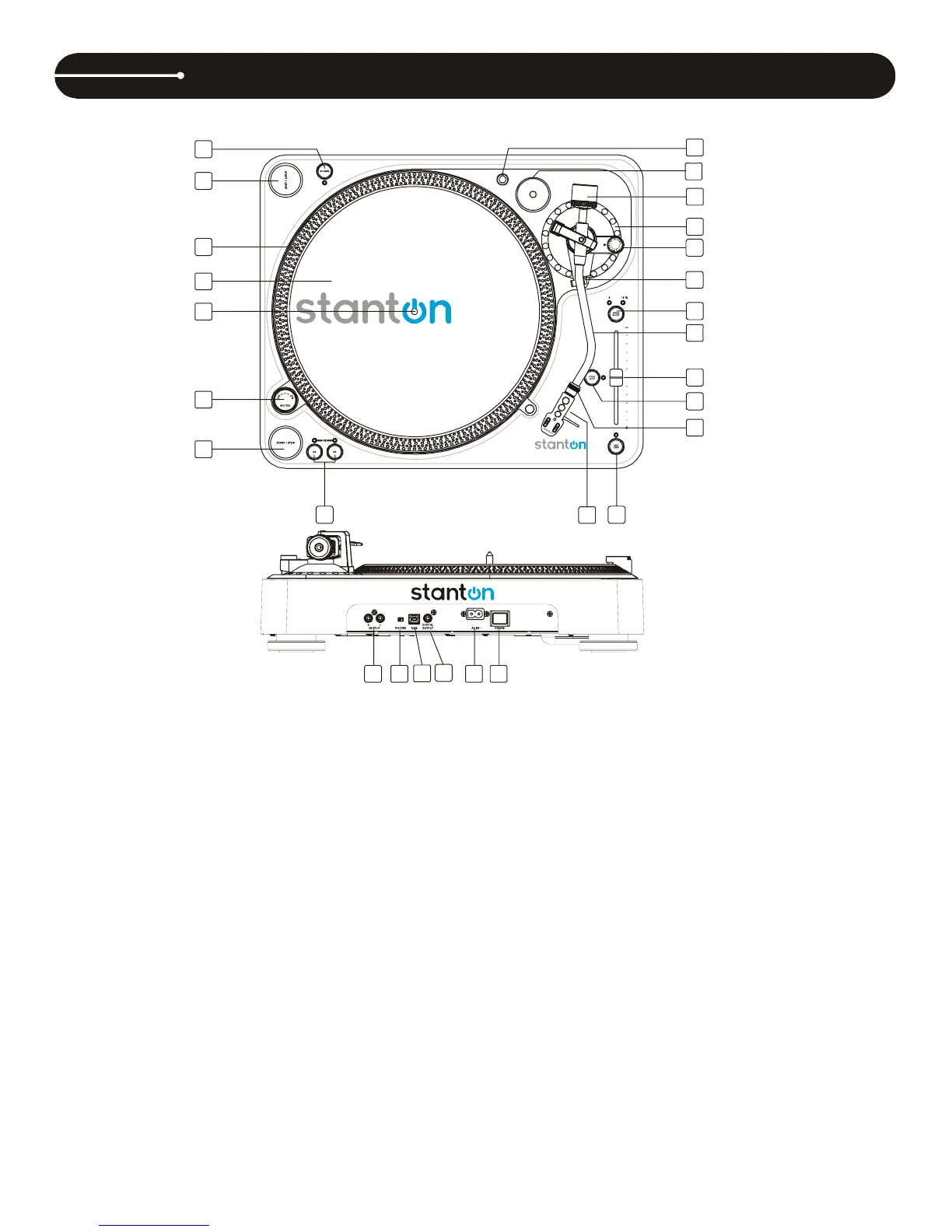 13. TONE ARM - This is a fully manual tone arm. To start playback,