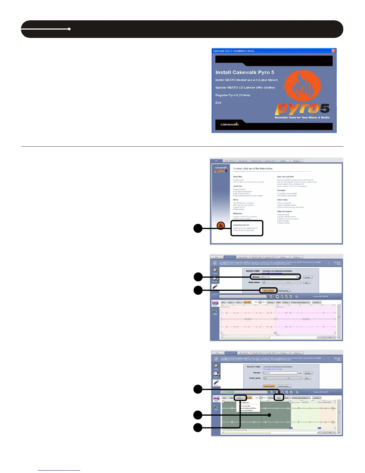 1.) From the Cakewalk Pyro 5 main page beginning with the Start tab,