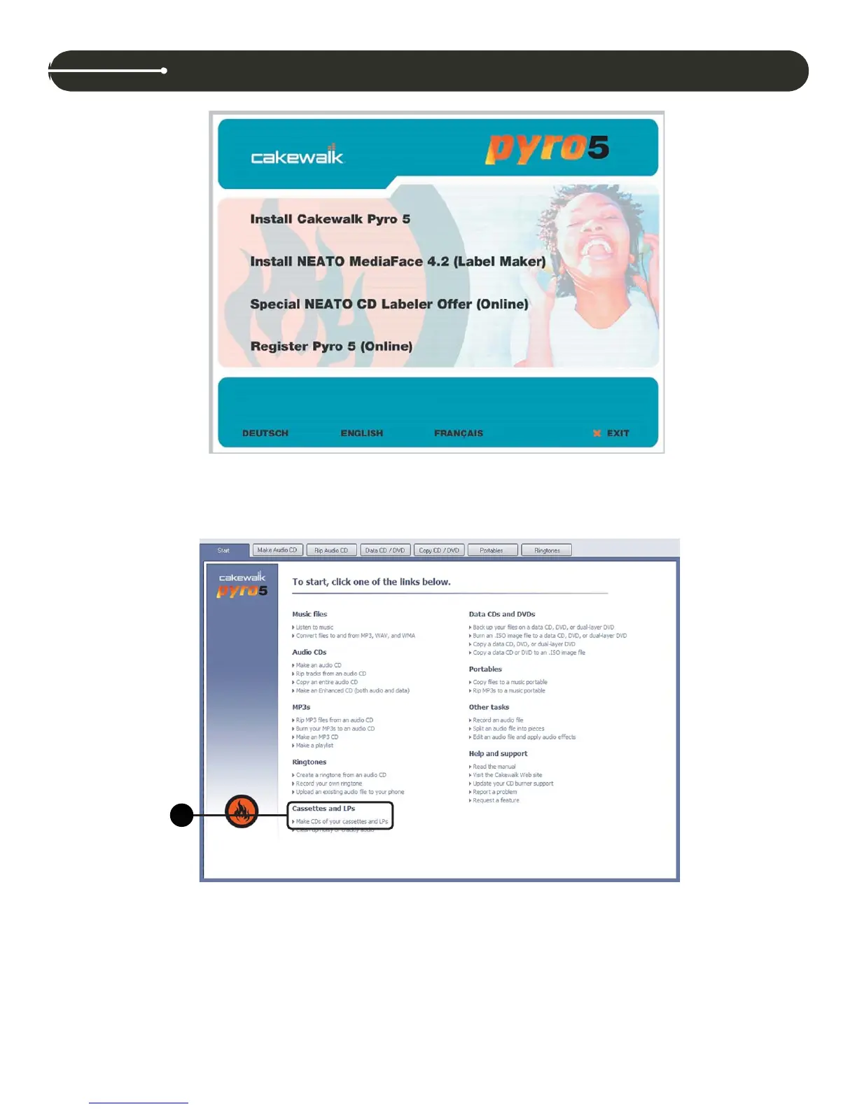 1. From the Cakewalk Pyro 5 main page beginning with the Start tab, start by clicking on the section entitled Cassettes and LPs - Make CDs of