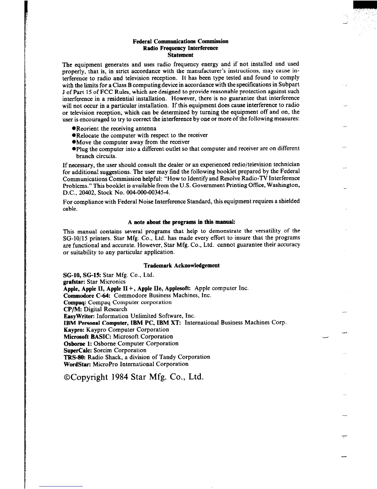 SG-lo/15 printers. Star Mfg. Co., Ltd. has made every effort to insure that the programs