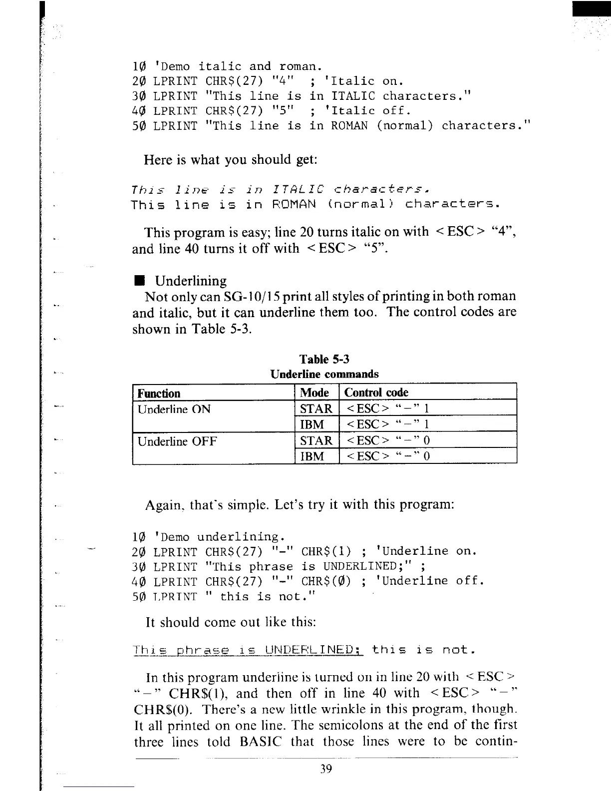 40 LPRINT CHR$(27) "-" CHR$(@) ; 'Underline off.