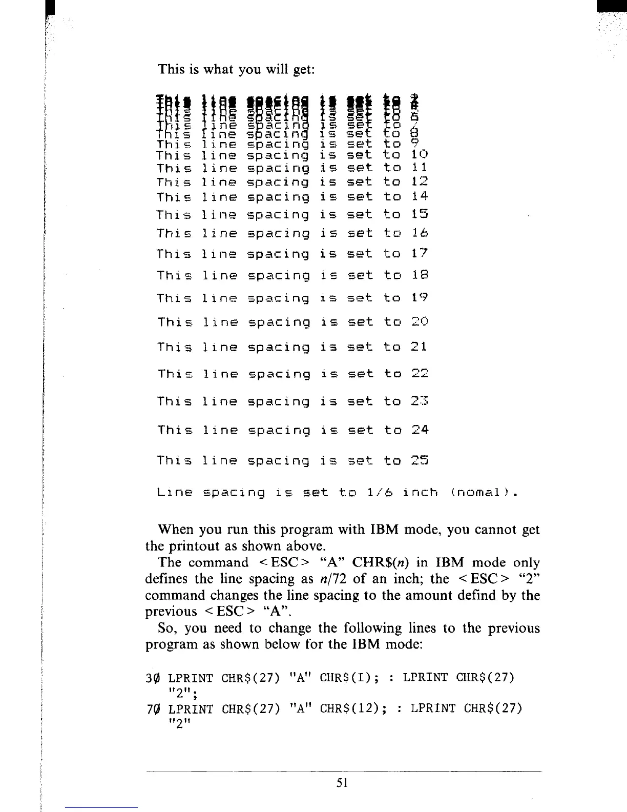 defines the line spacing as n/72 of an inch; the < ESC > “2”