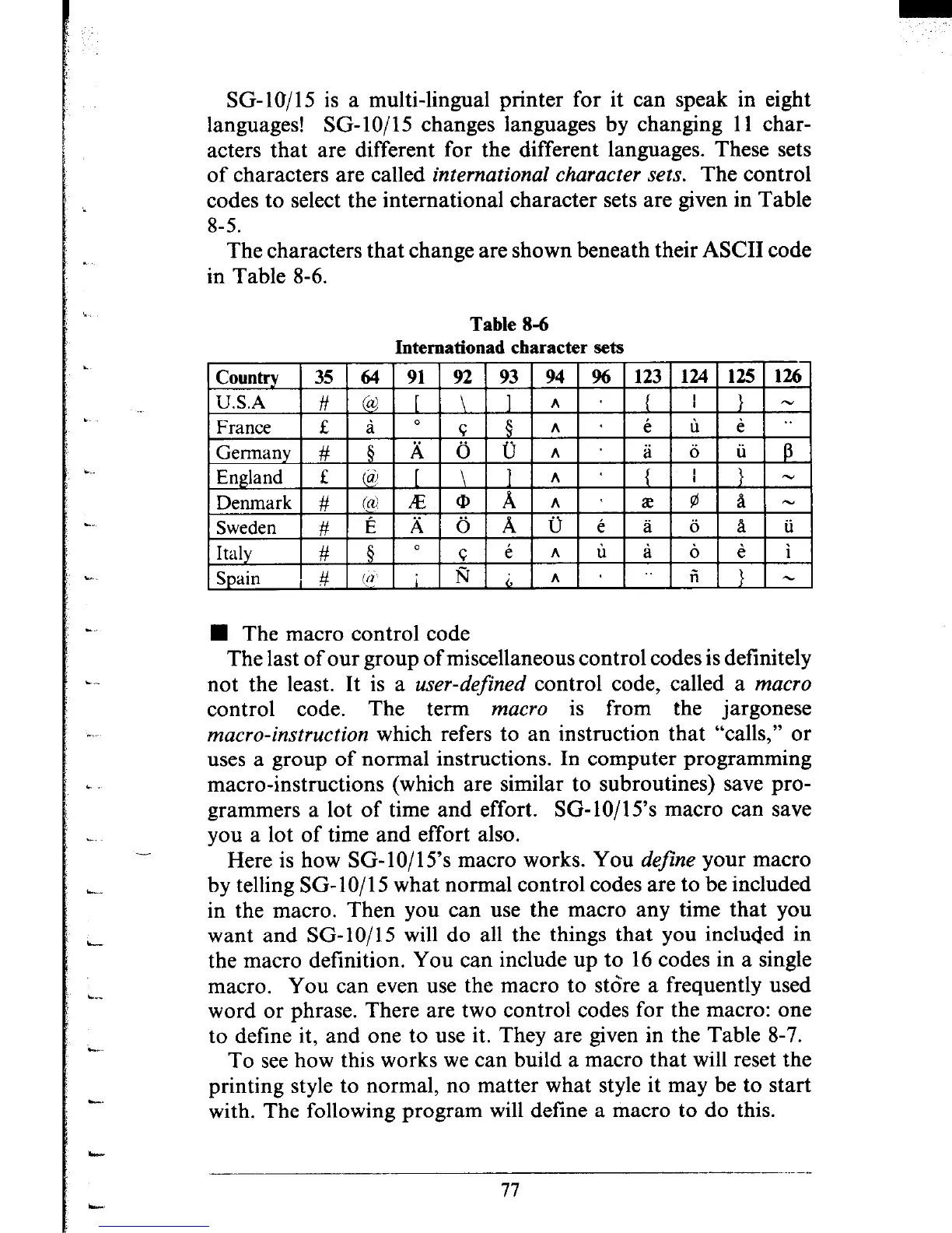 codes to select the international character sets are given in Table