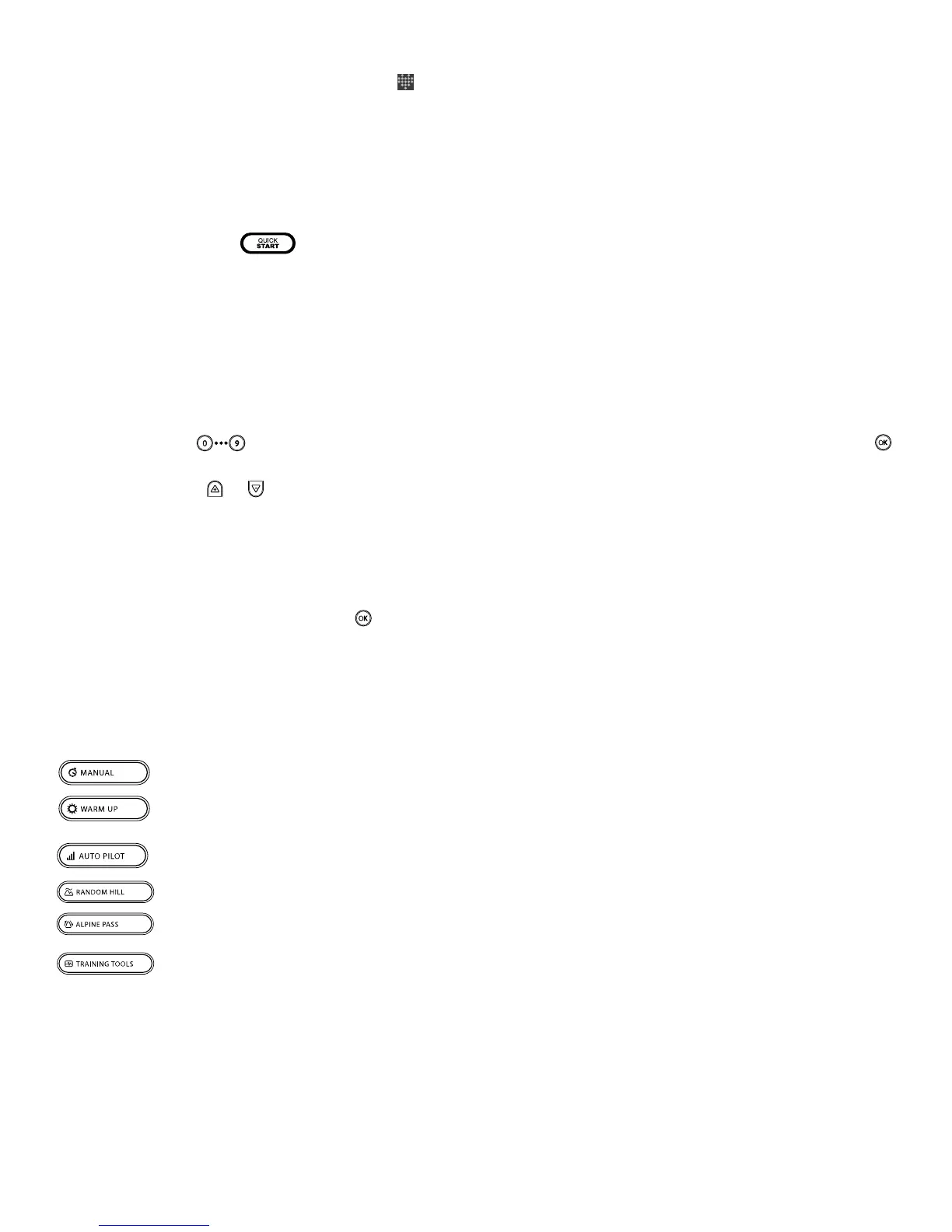 Quick Start lets you begin your workout by simply pressing one key, or by pedaling for approximately 10 seconds without pressing any