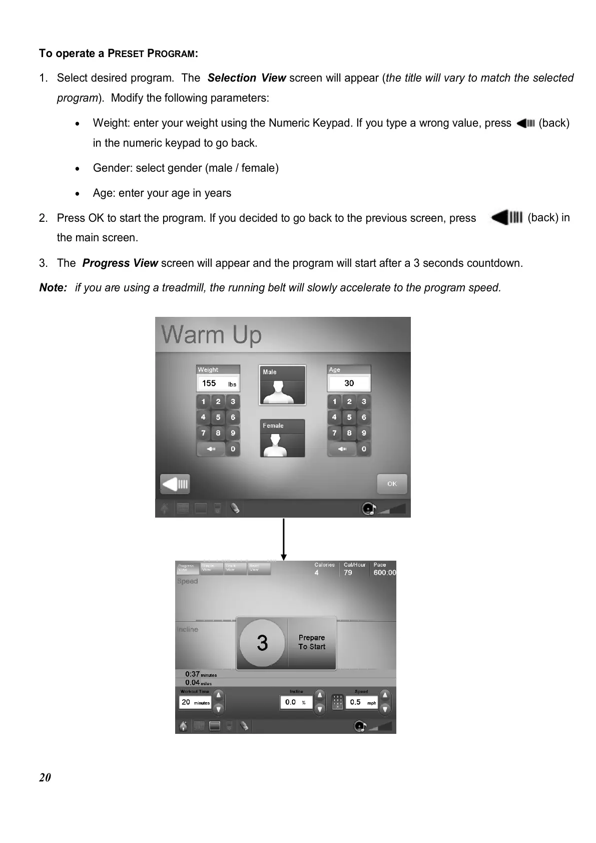 Note: if you are using a treadmill, the running belt will slowly accelerate to the program speed.