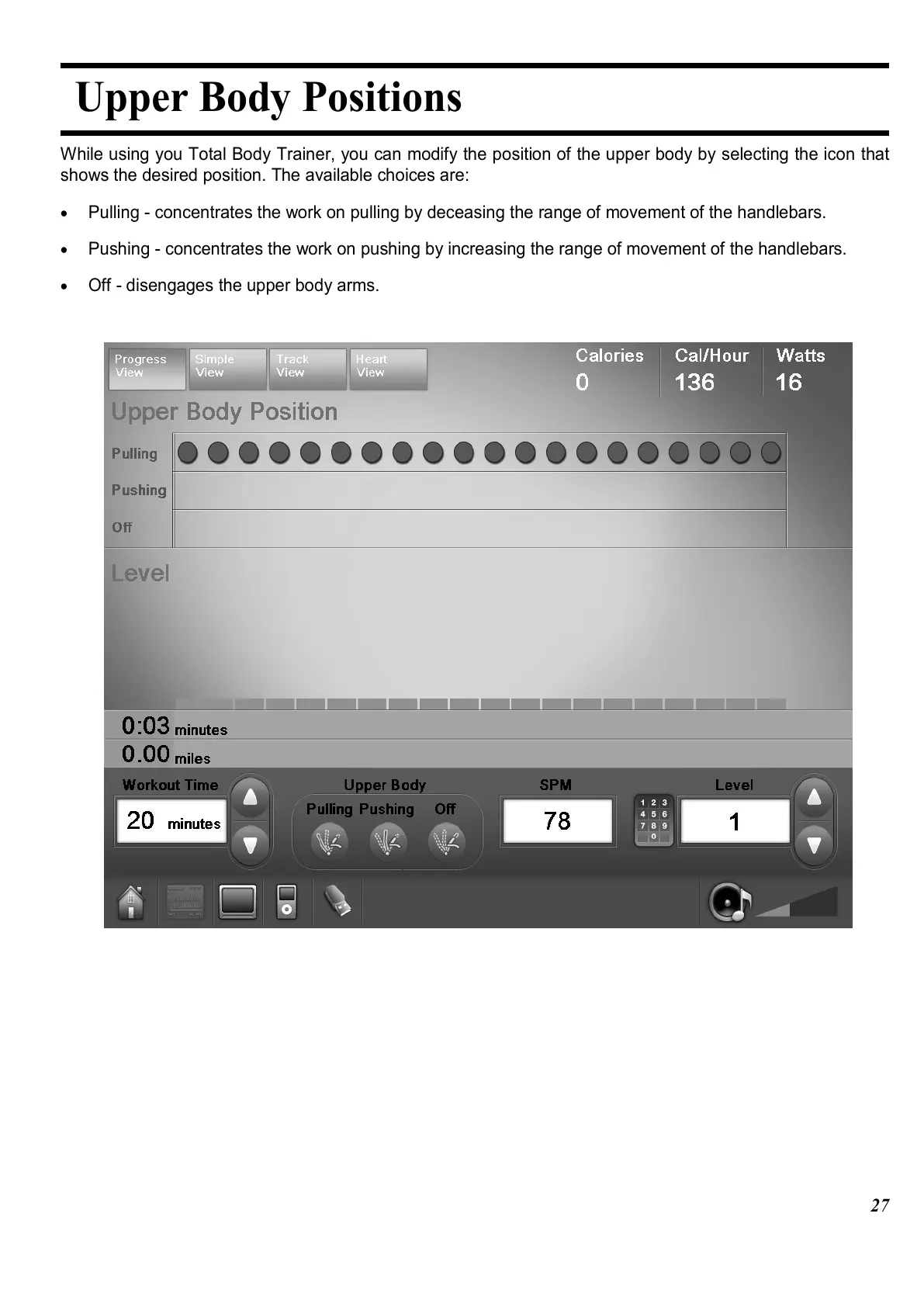 While using you Total Body Trainer, you can modify the position of the upper body by selecting the icon that