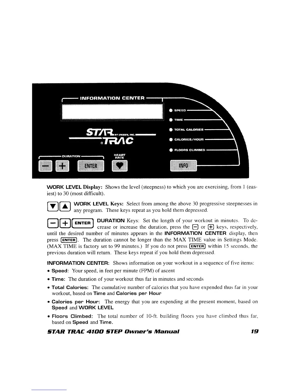 Star Trac SC4100 - Work Level Display; Information Center; Work Level Keys; Speed
