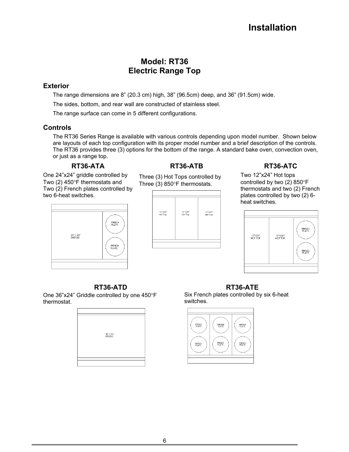 are layouts of each top configuration with its proper model number and a brief description of the controls.