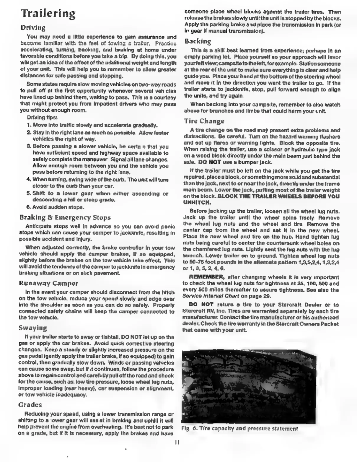 Starcraft 2005 - Trailering and Driving; Safe Driving Practices; Braking, Runaway, and Swaying Control; Tire Change and Maintenance