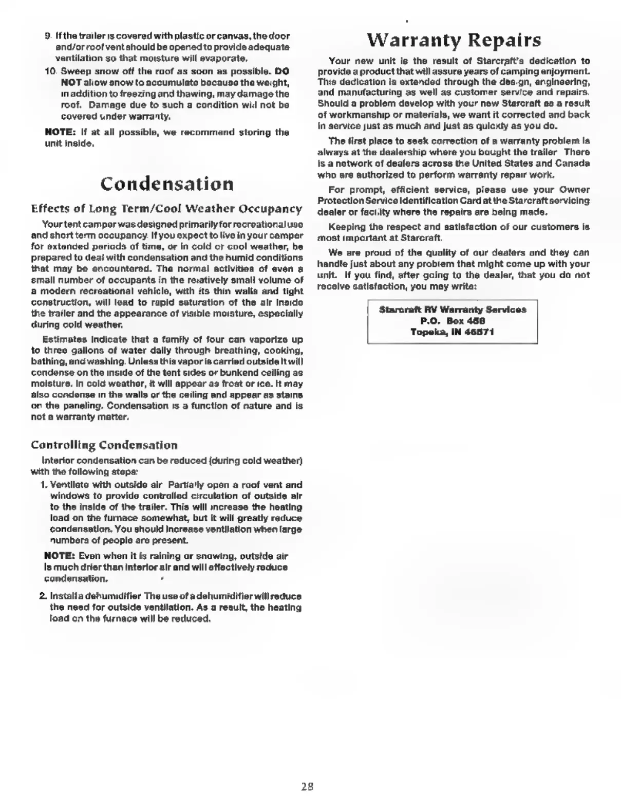 Starcraft 2005 - Storage, Condensation, and Warranty Repairs; Proper Camper Storage Procedures; Understanding and Controlling Condensation; Warranty Repair Process