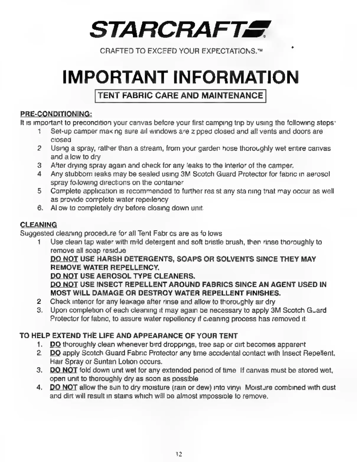 Starcraft 2005 - Tent Fabric Care and Maintenance; Tent Pre-Conditioning Steps; Tent Fabric Cleaning Procedures; Extending Tent Lifespan and Appearance