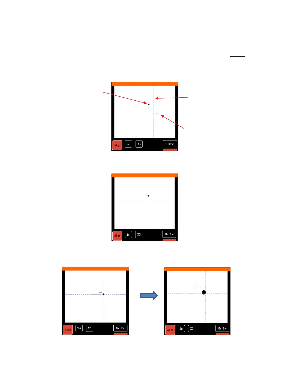 (6) Press OK. In the new photo, the blue dashed + should be close to the origin target. Press X3 to
