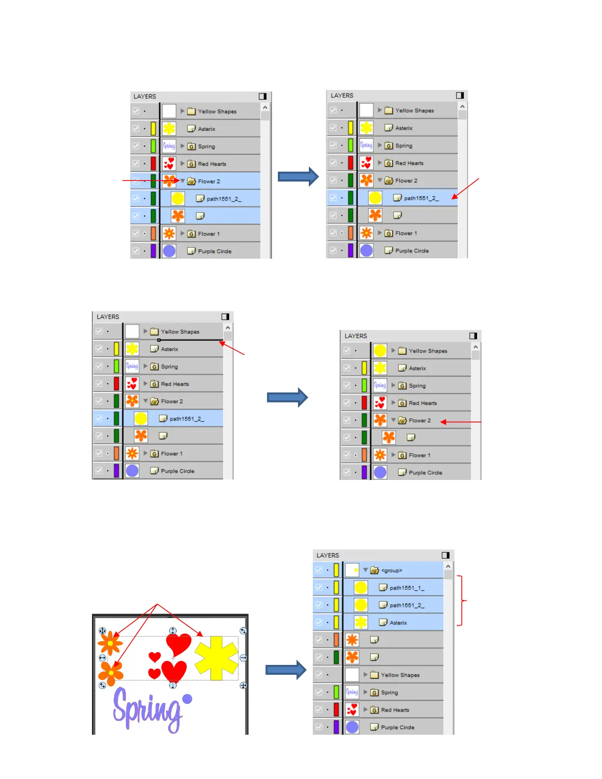 the Layers Panel with those shapes moved to it. Specific instructions on Grouping and Ungrouping are
