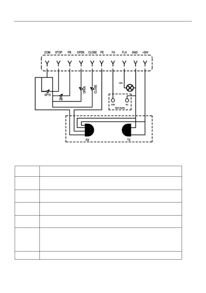 Zaciski riadenia prevádzky pohonu brány, pozrite si podrobnosti o jednotlivých funkciách.