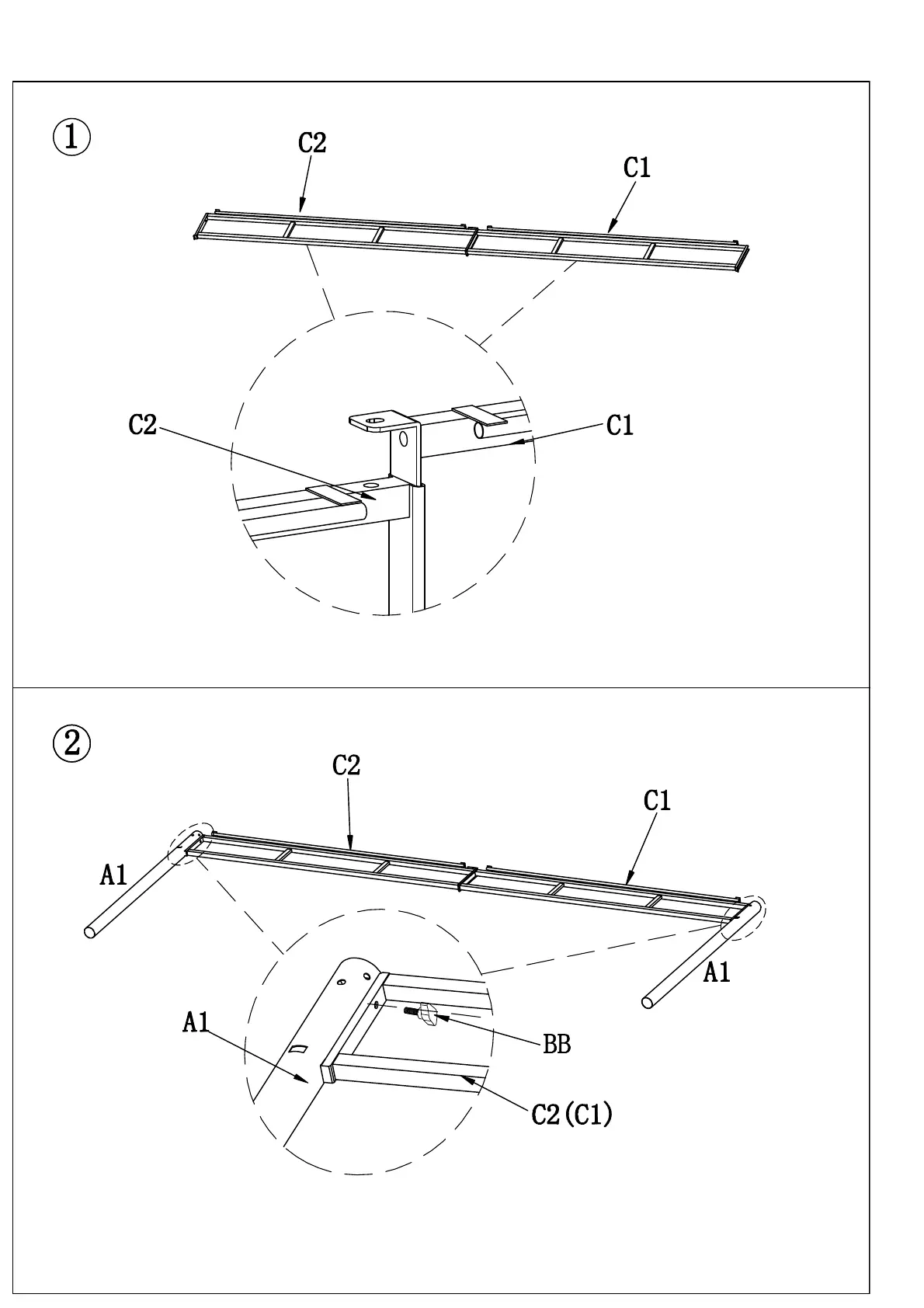 Step 2: Connect Top Leg Post (A1) to assembled Across Beam 1/2 (D1/D2), locking by