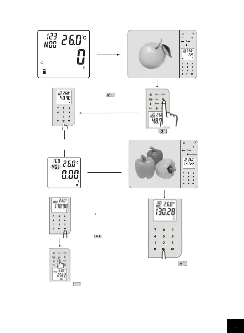 Sous le mode pesée ou de valeur nutritive, appuyez sur le bouton M + pour ajouter un poids ou une valeur